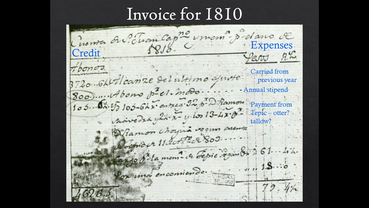 In the summer of 2024 I was graciously asked by Mechelle Lawrence Adams (Executive Director) and Jennifer Ring (Mission Archivist) to give four talks at Mission San Juan Capistrano. The first of these talks discussed the story of how the mission was supplied during the Spanish colonial era (1769-c. 1821). This talk was prompted by the exciting discovery of Mission San Juan Capistrano's account books in Mexico City by my friend Dr. Marie Duggan, an economist who teaches at Keene State College in New Hampshire. Not only has Dr. Duggan provided me scans of the account books, she's also graciously assisted me in understanding how they were organized, how the province of Alta California was supplied, and the translation and interpretation of what was ordered and sent to the mission. Additionally, a small group of top-notch historians such as Dr. Damian Bacich (San Jose State University) and David Rickman (historian of Spanish colonial material culture and creator and admin of the wonderful Facebook group "The Arts and Skills of the Spanish Borderlands") have assisted in this research. All of this said, the discoveries and translations in the presentation below undoubtedly contain errors. I invite anyone to share any insights they may have on this subject. With any luck, we'll continue to develop a better understanding of the rich and beautiful material culture present in Spanish colonial establishments on the frontier. A BIG thank you to everyone who continues to support this research!